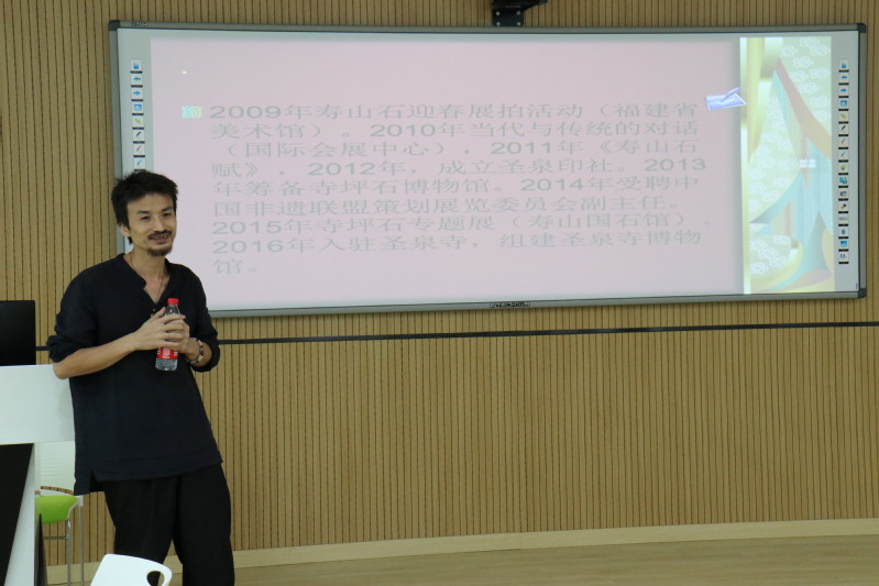 颜展先生在讲座上介绍寿山石概念的形成、寿山石的历史渊源、寿山石的生态构建。寿山石是文化的载体是文字的载体,颜展先生对寿山石IP系统应用在医药学、地质学、历史学、艺术史、雕刻工艺的概念进行解释。通过图片、视频等手段,带领学生们领略寿山石艺术的魅力,将原本晦涩难懂的概念形象具体化地进行讲解。颜展先生还现场展示了他的作品《寿山石赋》,既有理论又结合实际,赢得了在场同学们的阵阵掌声。