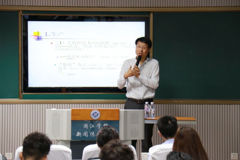 讲座中,张辉锋教授向我们介绍了新时代下新媒体的组成成分以及新媒体所处的发展情况和媒体发展的历程。“新媒体、新营销、新可能”是此次讲座的三个重点。“京东平台的成功,并不在于它的商品多、价格低、物流快,实际上是运用大数据技术的成功。”张辉锋教授以京东平台的成功为例,介绍了以大数据技术为支撑的智能传播的发展历程,以及智能传播如何重塑大众传播逻辑。他还通过直播“大衣哥”等案例,讲述了在数据驱动、“人人都有麦克风”的时代,大众传媒业怎样利用智能传播技术手段,“让用户离不开我”。张教授表示,大数据和人工智能对于新时代传媒业,具有十分重要的意义:“智能传播将会取代媒介融合,成为传媒业必须应对的新型主流形态。大数据分析与人工智能的发展将使传媒运营更为高效、精准,为传媒运营提供坚实基础。”张辉锋教授又结合我国国情,指出“一个新媒体的组成,是一个庞大的团队。”让大家了解到团队即人力,依靠人力打开市场渠道,才能让新媒体拥有更大的发展舞台,进而获得更大的宣传效果。其间,他还多次与现场同学交流互动,对学生提出的求学、专业、认知等相关问题给予详细解答。