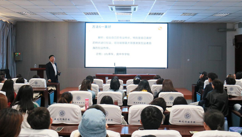 郭超以媒体多元化为切入,告诉在场同学对专业的认知要由点及面,不要让个人的认知局限限制了职业发展的上升通道。随后,他通过“赶潮”、“复合”、“整合”等六种创业方法对创业实践进行了指导,并结合孙正义,王兴等人创业的案例让现场同学更加理解创业背后的艰辛。此外,他还向同学们介绍了“互联网+”大学生创新创业大赛相关情况,并鼓励同学们多参与比赛,丰富自身见识,锻炼实践技能。