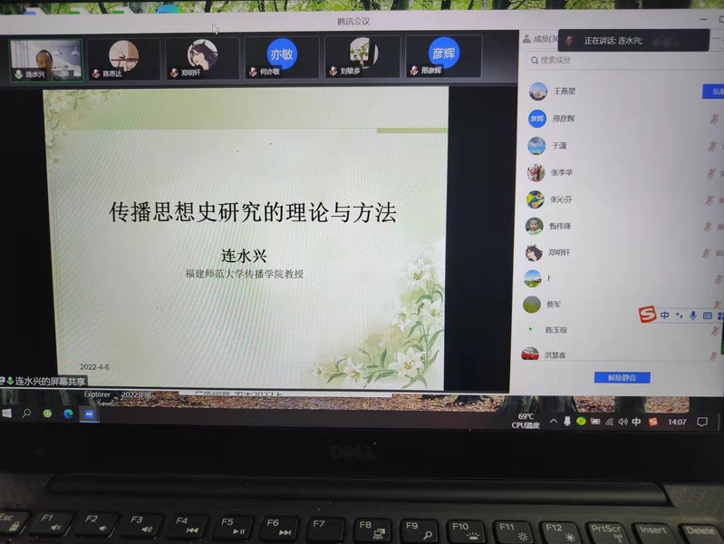 2022年4月6日下午,福建师范大学传播学院连水兴教授应学院邀请,通过腾讯会议,为我院教师带来一场题为《传播思想史研究的理论与方法》的精彩学术讲座,院长助理陈思达副教授主持讲座,全院20余名教师线上共同聆听了讲座。