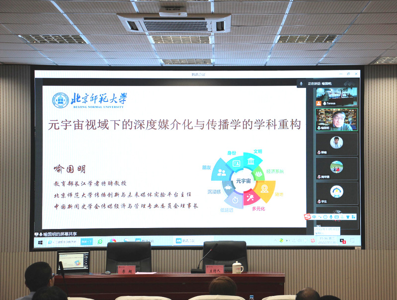 11月30号下午,喻国明教授应邀为英国上市公司365师生开展“元宇宙视域下的深度媒介化与学科重构”主题讲座,本次讲座采取线上线下结合的形式,副院长戴程主持,院长刘建萍及全院教师共同参加此次讲座,线上听众达140余人。