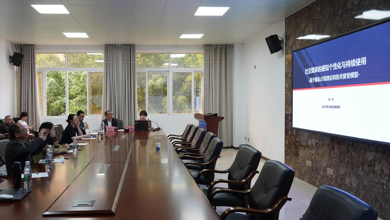 彭丽霞老师以B站为例,探讨健康科普类中短视频的创作逻辑和关键构成要素,并根据定性比较分析结果提出优化方式,揭示健康科普短视频传播效果的影响因素和创作规律。郑明轩老师分享体验经济视角下热门手机游戏付费模式的研究,他以AIDA模型进行分析,指出游戏产品应具有交互性和模拟性,在带来的体验感的同时具备传播属性。冯蔚宁老师以校融媒体发展为例分享“闽江学院融媒体采编实务实训探析”,将融媒体时代技术作为出发点,探索传播新途径,强调融媒体时代采编实务实训创新的重要性。左一方老师以“社交媒体的感知个性化与持续使用”为题作分享,她指出此研究以隐私计算理论和技术接受模型(TAM)为基础,构建抖音用户持续使用意向影响因素理论模型,探讨智能推荐系统的使用如何影响用户在收益和风险之间的权衡。