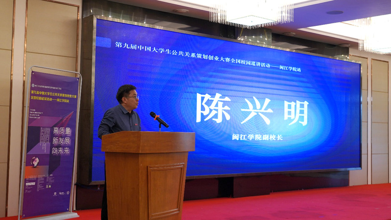 闽江学院副校长陈兴明发表致辞。他首先向到场的嘉宾及师生代表表示热烈欢迎,并指出,中国大学生公共关系策划创业大赛的设立、优秀企业的加入、高校的合作与学子们的积极参与和闽江学院“不求最大,但求最优,但求适应社会需要”的办学理念不谋而合。本次活动不仅提高了公共关系行业的社会影响力,也搭建了一个高校公共关系及相关专业的产学研平台。他呼吁同学们以热情、认真的态度,充分运用战略思维、国际视野和创新精神参与到本次大赛中来。