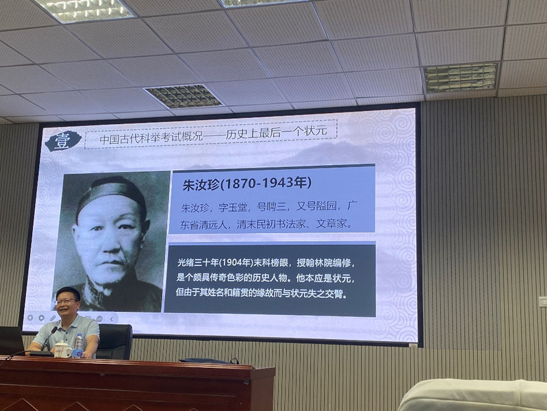 下午两点,讲座正式开始,林主任基于自身扎实的学术研究以及丰富的传媒经验,在讲座中与到场的师生分享了福建古代46位文状元的趣闻轶事,为同学们介绍了中国古代科举考试概况、福建的古代状元和古代科举考试制度,期间他通过福建状元的小故事结合相关趣味短视频,使得整场讲座趣味十足。身为传媒工作者的他在普及古代科举常识的同时不忘介绍其在“今日头条”上的传播实践,探讨互联网思维下的新媒体传播规律、流量密码。其中林主任分享的爆款标题传播规律以及标题写作中需要关注的点及创作要求,对在场有志于自媒体内容创作的同学启发性很大。