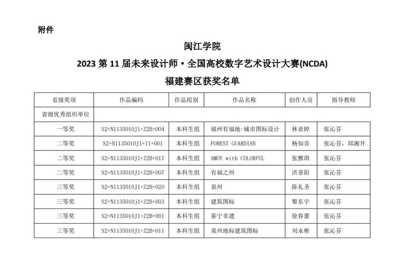 在2023年第11届未来设计师•全国高校数字艺术设计大赛(NCDA)中,我院学子斩获福建赛区一等奖1项、二等奖3项、三等奖4项,如此优秀战绩体现了我院学生良好的艺术与人文素养,一展新传风采。