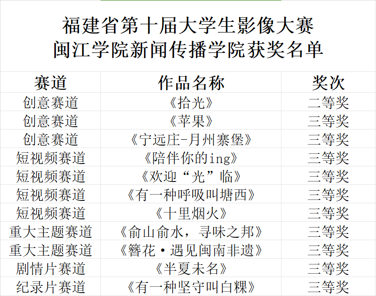 在福建省第十届大学生影像大赛中,作为重大历史转折的参与者、见证者、记录者和传播者,新传学子积极参与“影像福建”的创作与传播,施展创作风采与实力,在各大赛道屡获佳绩,喜报连连。