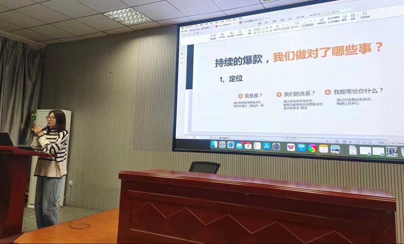 编导陈潇滢以“Happy猫与香蕉猫小剧场”为例,向同学们介绍了短视频创作的相关内容。在讲解过程中,同学们边观看账号视频边聆听讲解,反响热烈。她详细解读了如何打造爆款短视频,并通过案例分析,讲解了如何通过定位、内容和粉丝反向赋能打造爆款短视频,以及如何将IP形象强化并实现转化。