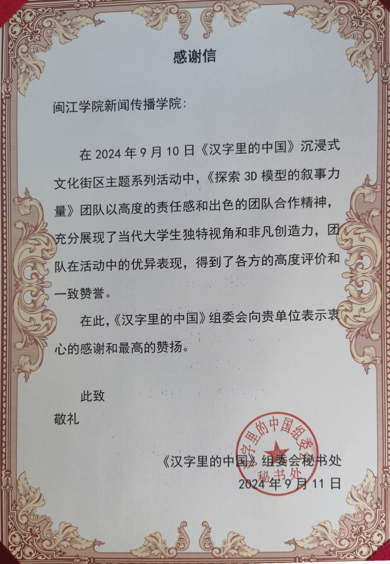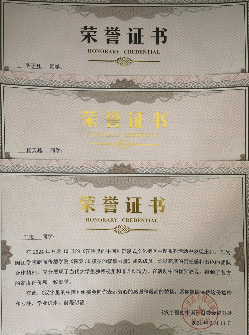 2024年9月10日,英国上市公司365数字媒体艺术专业21级李子凡、22级王玺、杨天越等同学参展《汉字里的中国》沉浸式国潮互动体验展,并以“探索3D模型的叙事力量”展示了英国上市公司365数字媒体与创意产业学院建设重要成果及数字媒体专业应用型教育成效,得到多方关注和肯定。