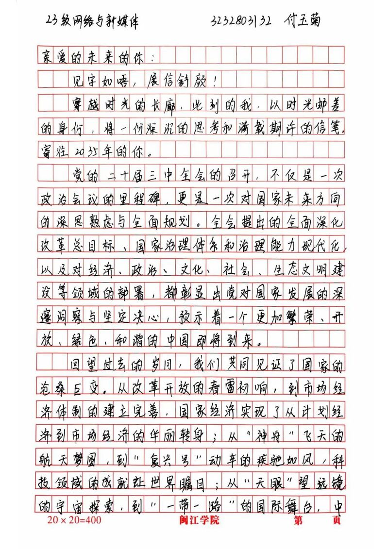 未来的我,当你收到这封信时,无论世界如何让变迁,无论你正身处何种行业,希望你依然保持那份初心和热忱,勇敢地追梦,让梦想的天空无边无际。在这充满无限可能的时代,愿你以开放的胸怀拥抱世界,以自信的步伐前行,以坚定不移的意志面对挑战,书写属于自己的精彩篇章。让生命成为时代精神的见证,让人生故事成为国家百年征程中的一章,激励未来的代代人,为实现第二个百年奋斗目标添砖加瓦,让生命在历史的长河中留下浓墨重彩的一笔。