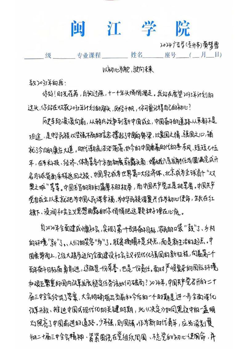 时光流逝,十一年以后,很多现在不能攻克的难题也许已经成为现实,你或许会看见神舟30号奔赴星辰大海,或许会发现疑难杂症有了解药,或许会察觉人民之间不平衡不充分的矛盾已经消失……2035年的你,当你看到这封信时,一定见证了中国日新月异的变化,感受到社会蓬勃向上的发展,希冀着中华民族伟大复兴的到来,会比现在的我更能体会到“何其有幸,生于华夏”的深刻含义。