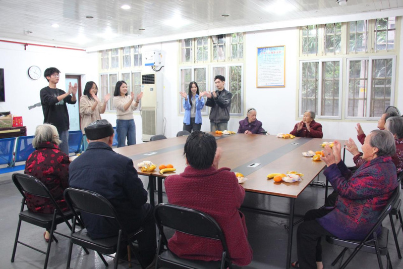 参观结束后,同学们前往象纬村敬老院开展慰问活动。在敬老院里,同学们为老人们表演了精彩的唱歌节目,歌声悠扬,传递着青春与活力。紧接着,他们还耐心地教老人们做手指八段锦,通过简单的动作帮助老人们活动筋骨,增强身体机能。老人们学得津津有味,脸上洋溢着幸福的笑容。同学们精心策划了趣味互动游戏,老人们在游戏中不仅能赢得小礼品,也能获得挑战的乐趣。这些活动让老人们感受到了温暖和关爱,更让学生们体会到了弘扬尊老爱老传统美德的重要性。最后,同学们将带来的慰问品亲手送到老人们手中,并帮忙打扫了敬老院的公共卫生区域,为老人们创造了一个更加整洁、舒适的生活环境。