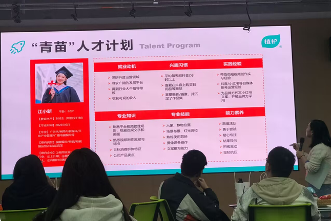 此次活动的亮点是校企双方再次共同推进“青苗计划”集训营项目,并由植护HR翁晓梅女士为21级招募入营学生带来一场别开生面的宣讲会。