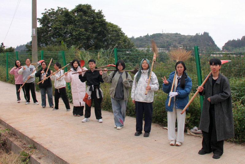 座谈会结束后,同学们前往农业园开展环境整治劳动,为即将启动的项目主体工程建设助力。农业园内,已经修好的水泥路两旁杂草丛生,路面散落的土块和杂物影响车辆通行。同学们领取劳动工具后分工协作:手持锄头的同学清理路边杂草,铁锹队伍将杂物集中堆放,扫把组则细致清扫道路。在同学们的齐心协力下,道路很快恢复整洁畅通,农业园的环境得以改善。在劳动中,同学们还感受到了田园风光的魅力,牛群悠然,羊群归圈的景象让人倍感自然之美。
