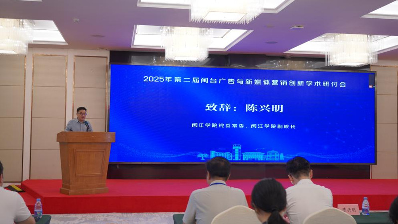 闽江学院党委常委、副校长陈兴明出席大会并致辞。他表示,闽台两地一水相连、文化同根,数字化与智能化发展为两岸交流提供了新机遇。他强调,广告与新媒体营销已成为促进闽台文化传播、深化两岸情感联结的重要桥梁,期待本次会议能够推动产学研深度融合,为两岸协同创新注入新动力。