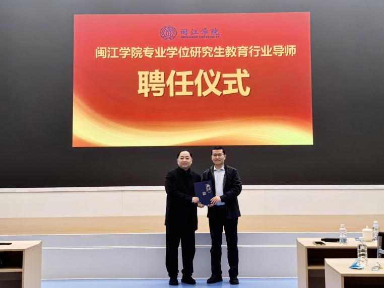 实践教学伊始,校企双方举行了简短而隆重的行业导师聘任仪式。戴程副院长代表学院向陈航颁发了“闽江学院专业学位研究生教育行业导师”聘书。